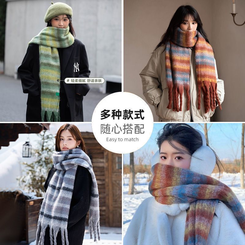 韩版新款女秋冬季复古渐变色条纹围巾学生围脖加厚保暖马海毛披肩