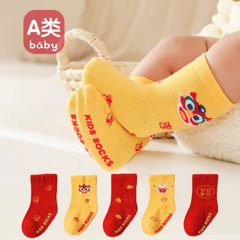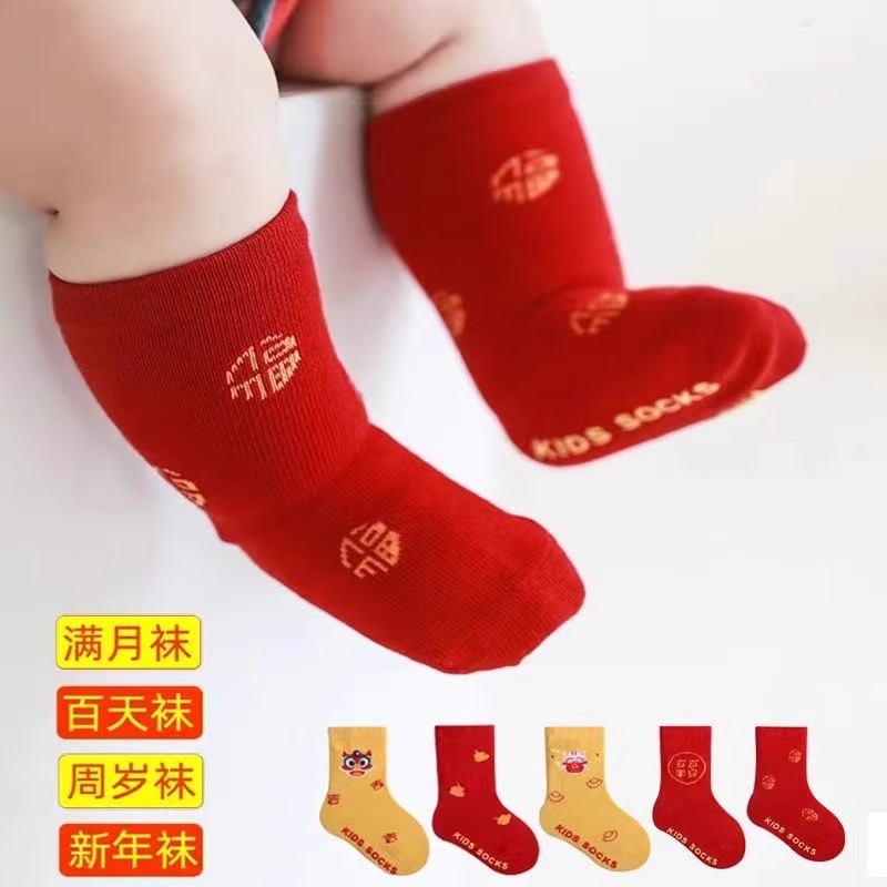宝宝大红色袜子春秋薄款新生婴儿绒棉儿童秋冬新年百天周岁过年袜