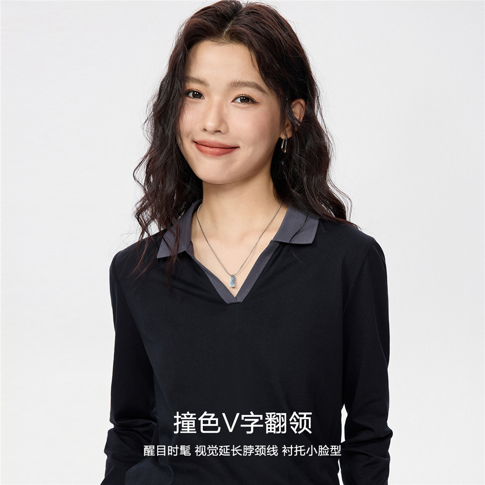 佐丹奴v领Polo衫女纯棉长袖polo领上衣撞色翻领保罗衫女13315653