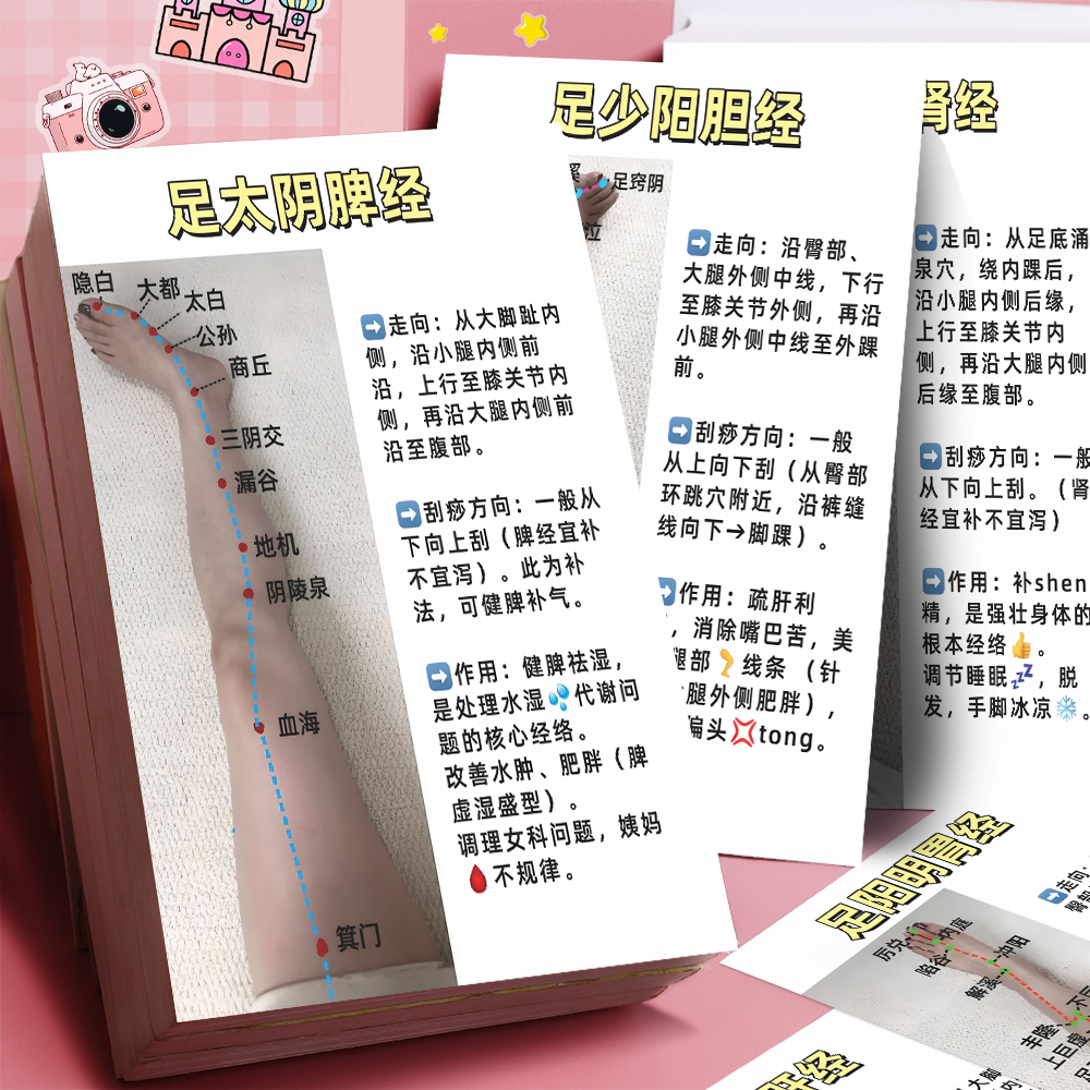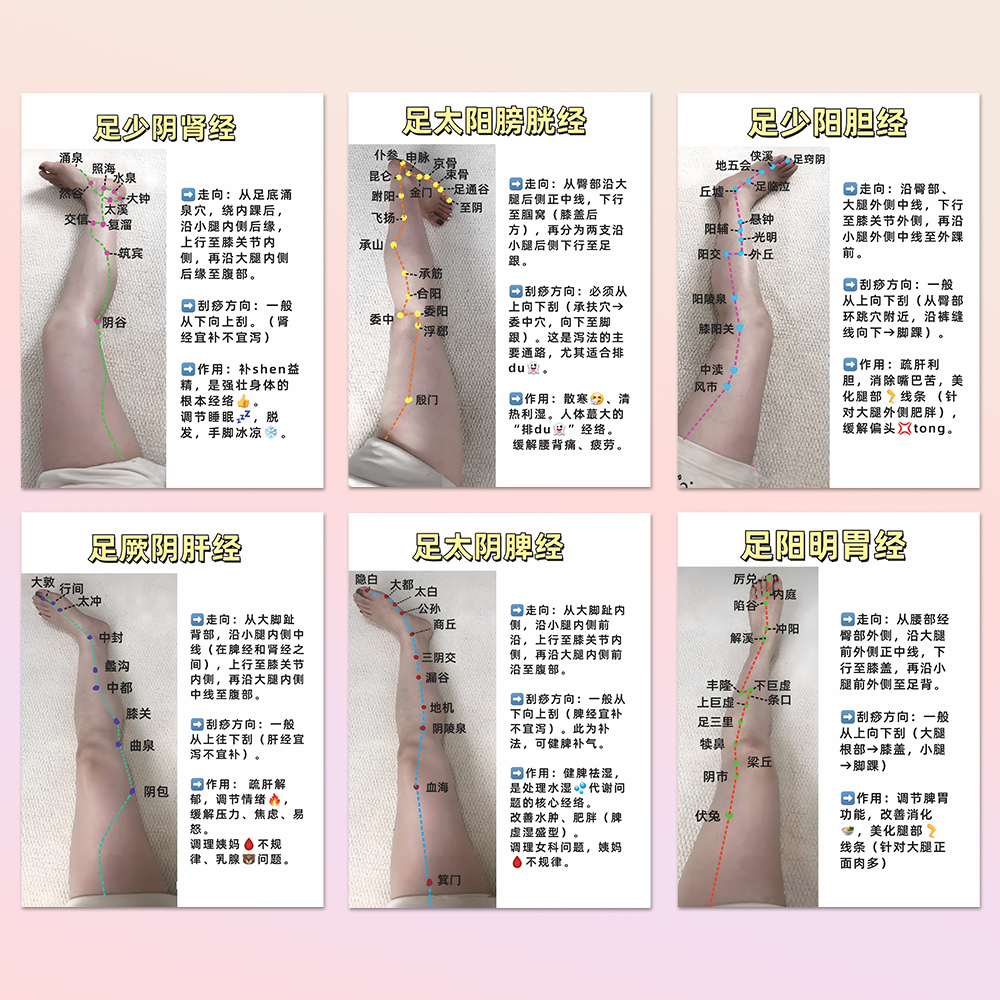 腿部经络刮痧拍立得】中医养生十二经脉疏通穴位按摩手法科普小卡