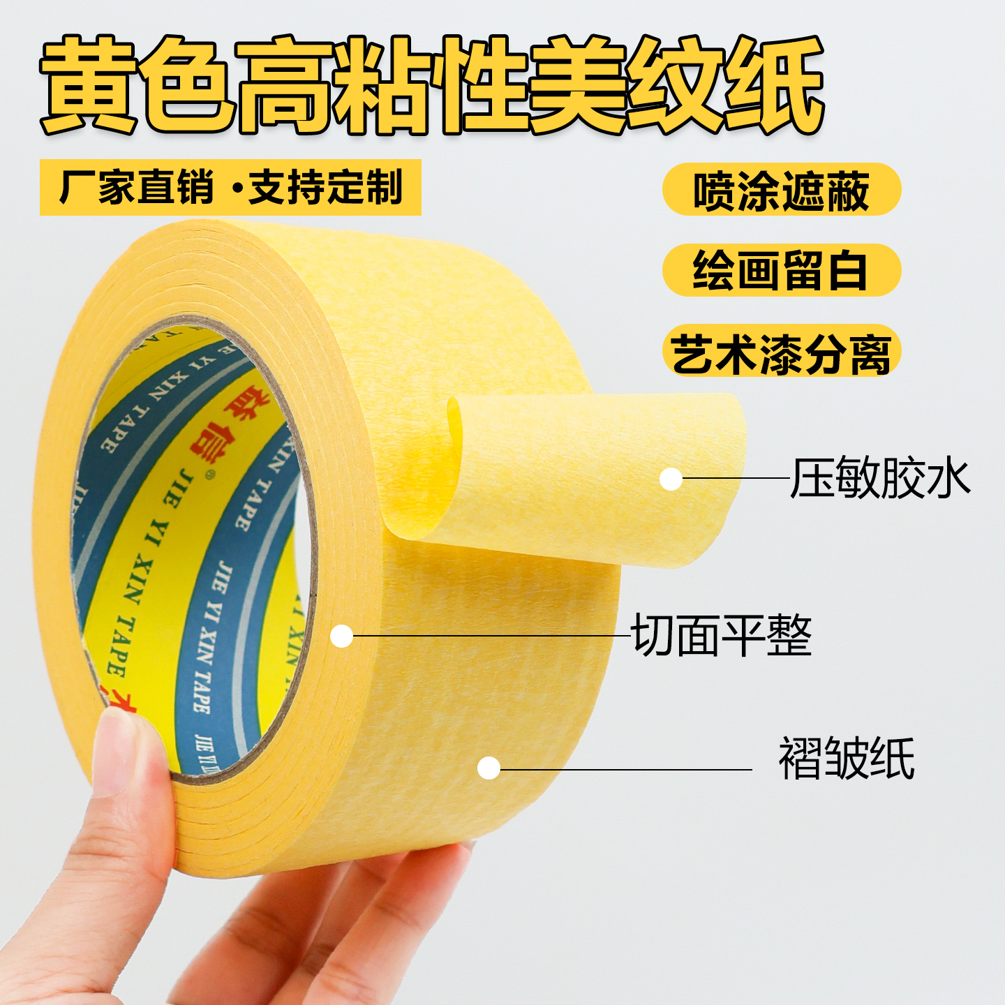 黄色美纹纸胶带强高粘装修喷漆遮蔽保护贴纸刷墙面无痕不留胶外墙真石漆专用美纹纸美缝纸美文胶纸胶带分色纸