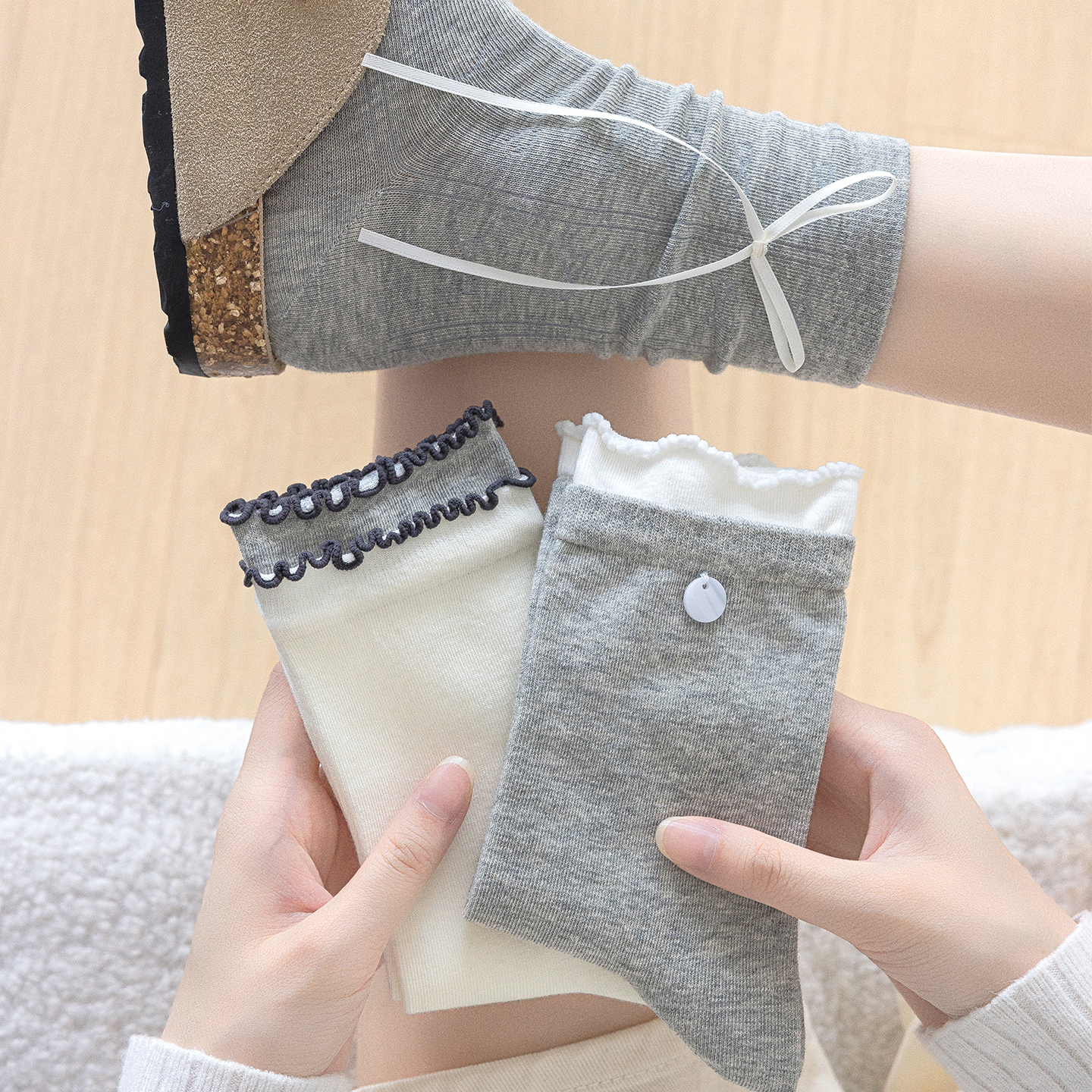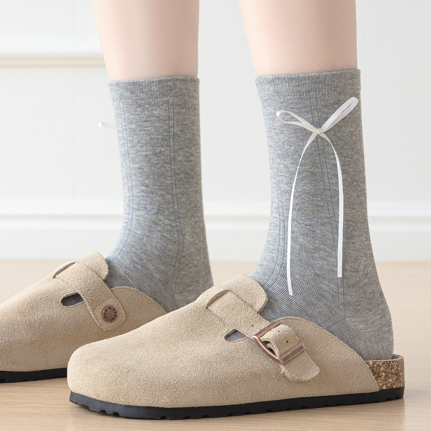 miu系灰色袜子女堆堆夏季薄款中筒棉芭蕾风蝴蝶结小腿袜配德训鞋