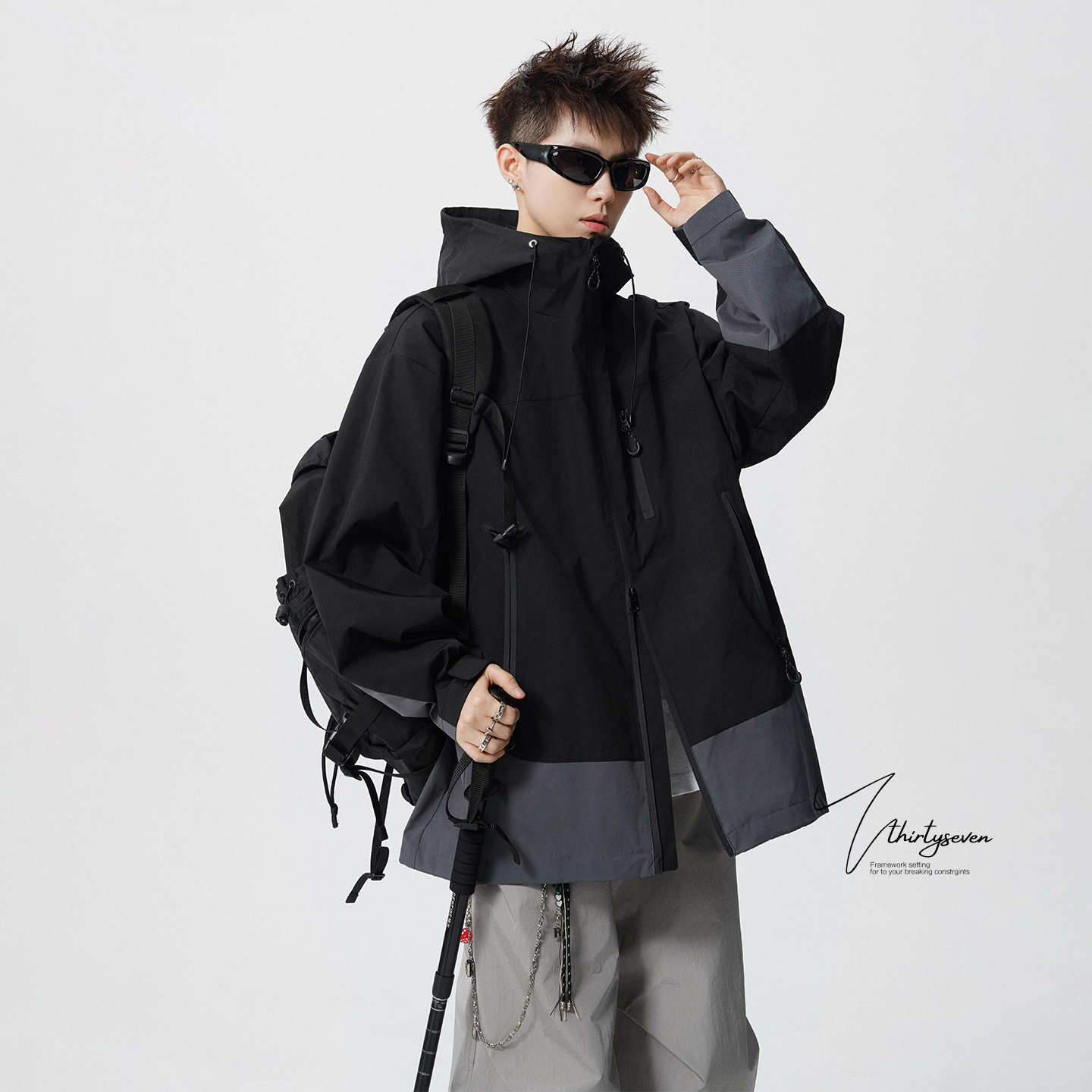 V37美式机能风紫色连帽冲锋衣男秋季潮流户外宽松休闲工装夹克潮