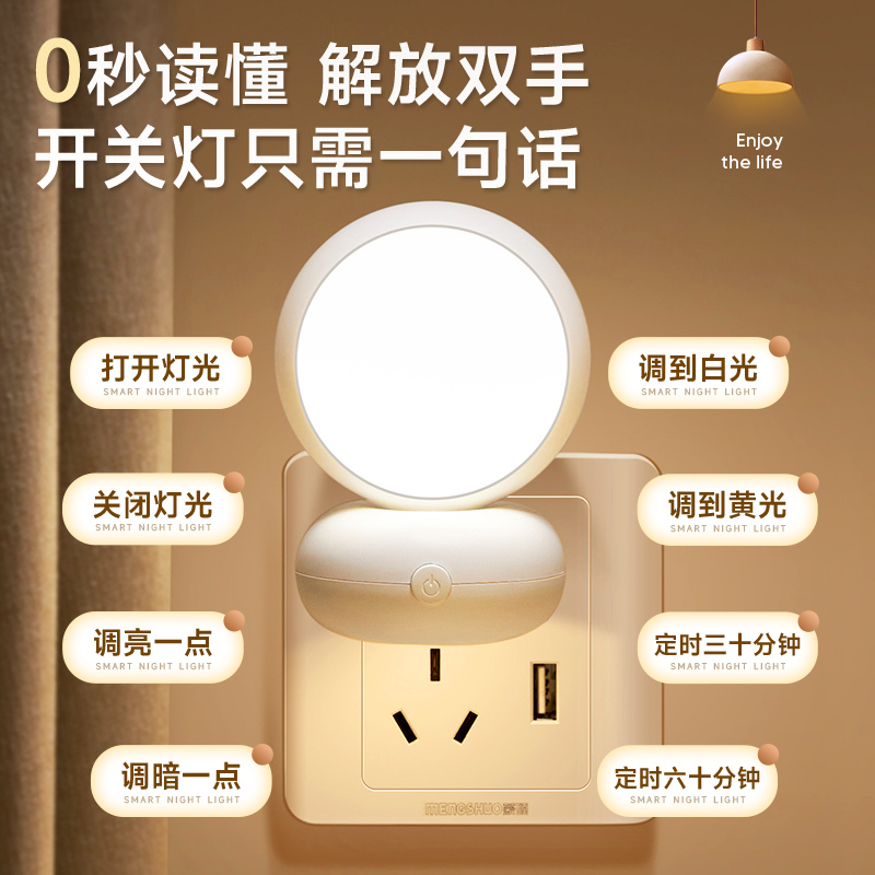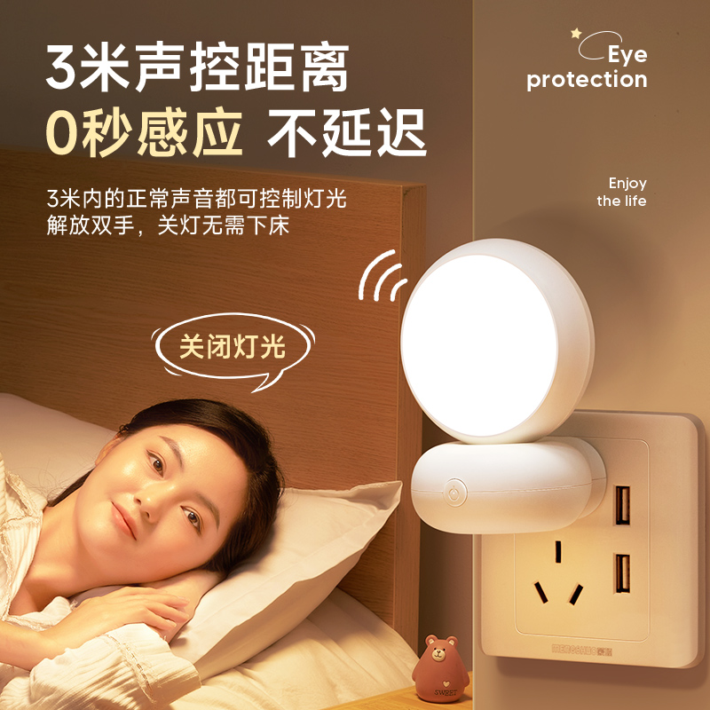 智能语音控制声控感应小夜灯卧室床头睡眠遥控家用插座式儿童台灯