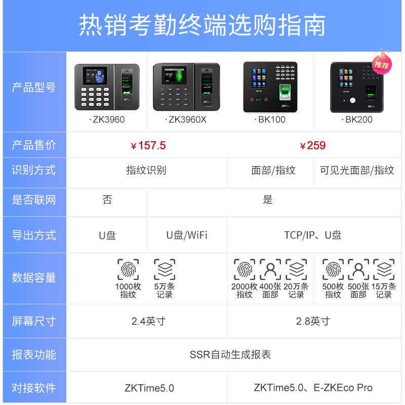 ZKTeco熵基科技zk3960X指纹式打卡机BK200人脸识别考勤机公司员工