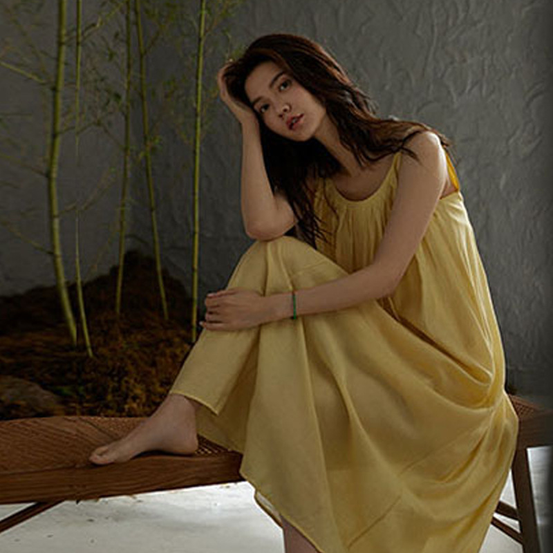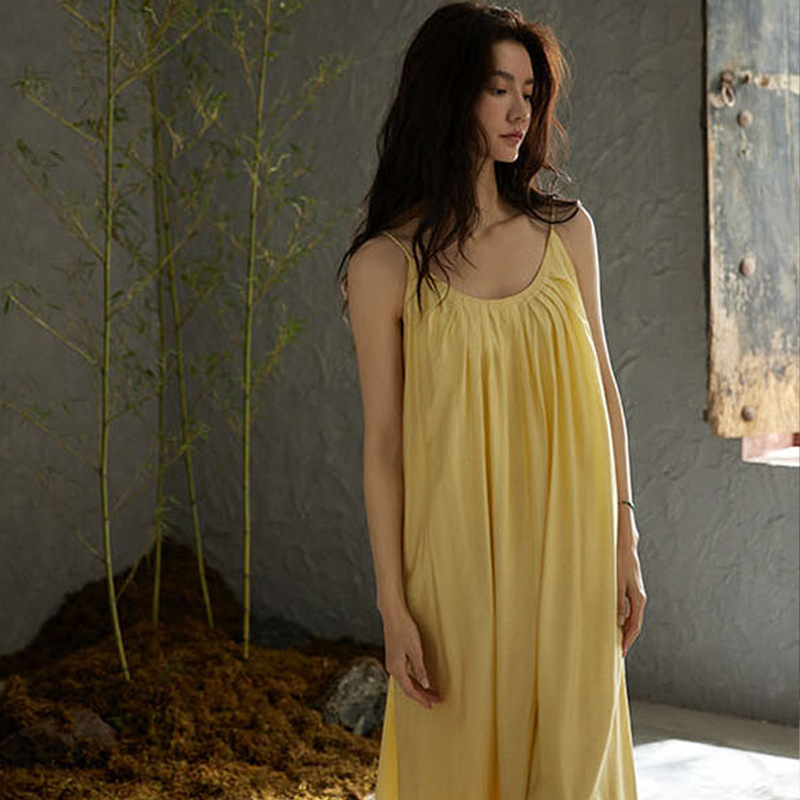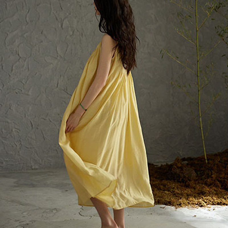 度假风法式黄色吊带连衣裙宽松慵懒风夏季新款露背性感淡黄的长裙