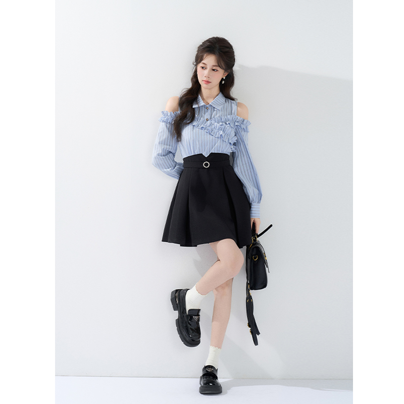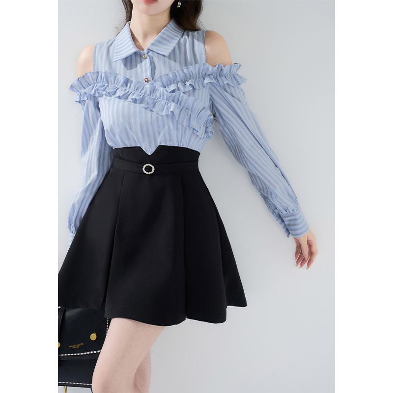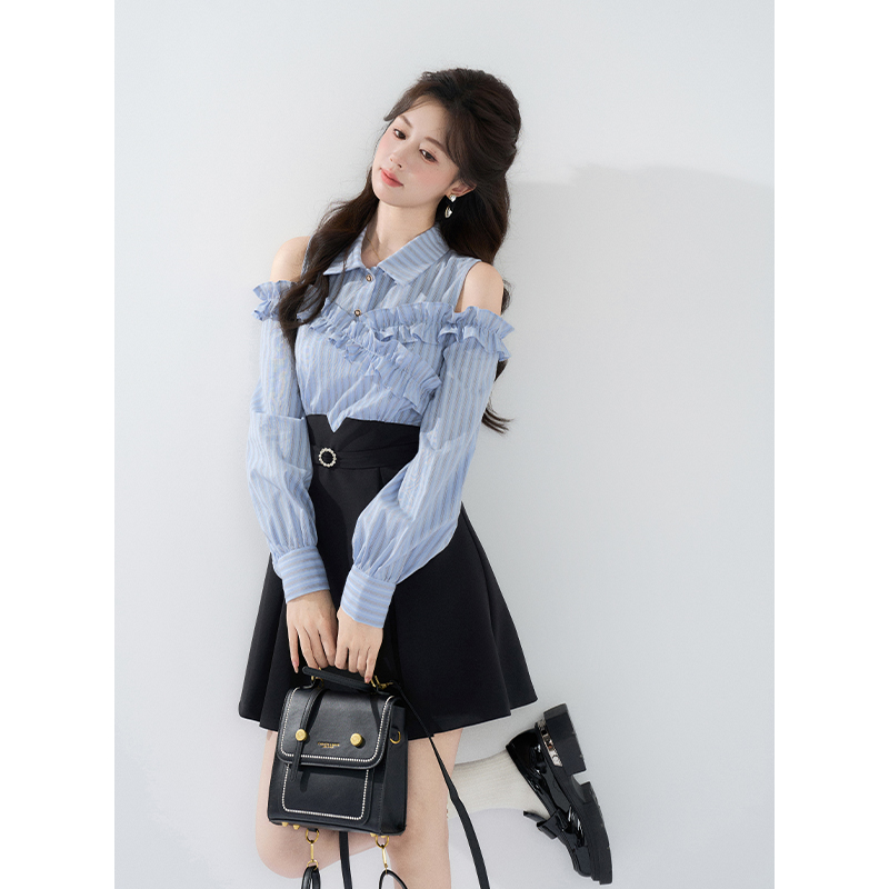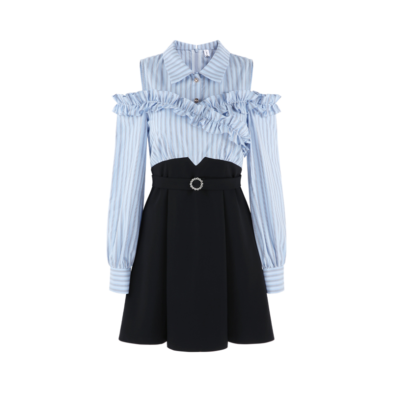 法式露肩衬衫长袖条纹连衣裙女秋季新款高级感假两件高腰显瘦裙子