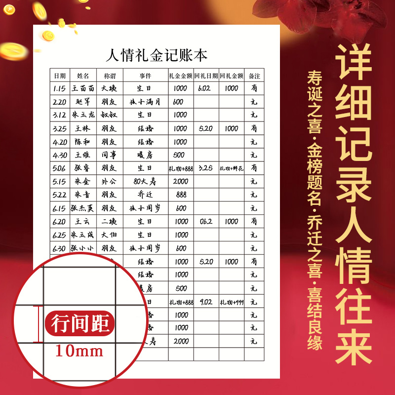 人情礼金往来记账本随礼收礼寿宴婚礼礼单签到簿家用手帐明细账记录本红事回礼簿家庭现金记账簿登记账本家用