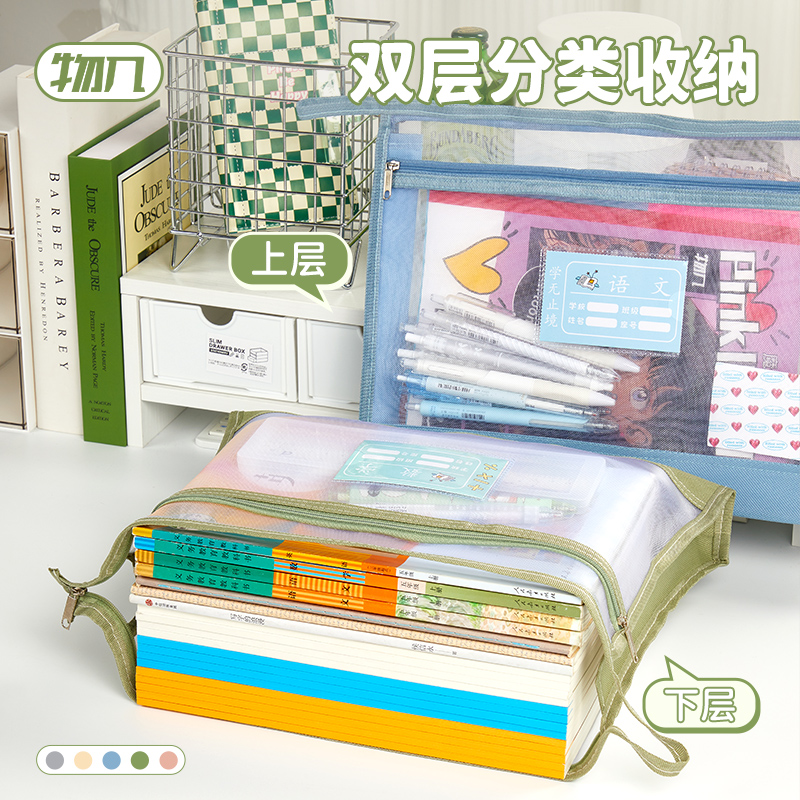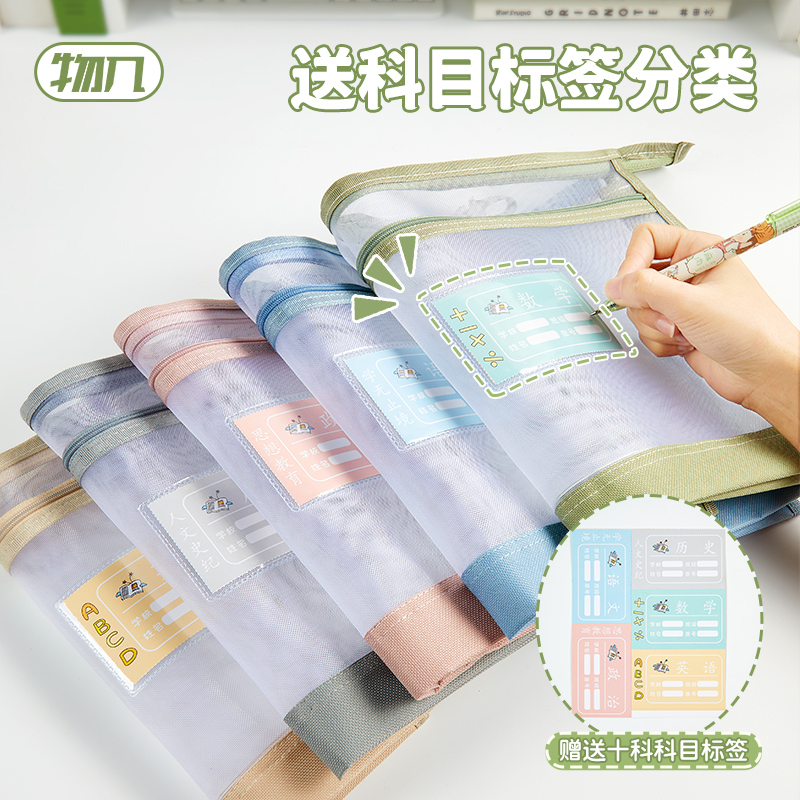 物几网纱双层科目分类袋简约耐用收纳袋初高中透明大容量文件袋拉链式办公学生试卷收纳资料袋通用男女款文具