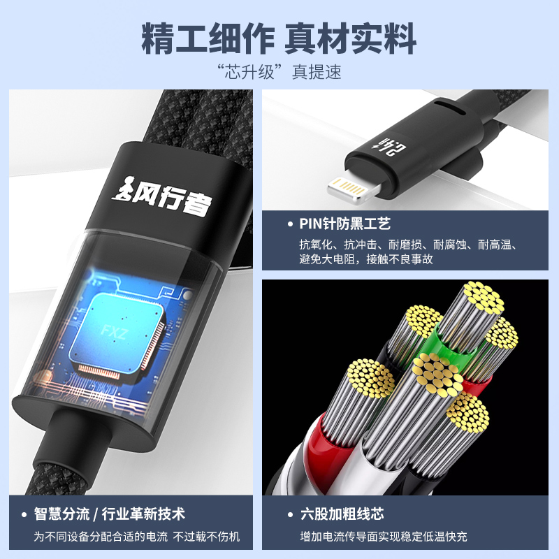 风行者一拖三数据线三合一充电线适用华为66W超级快充荣耀OPPO一加100W闪充USB车载多头苹果安卓手机