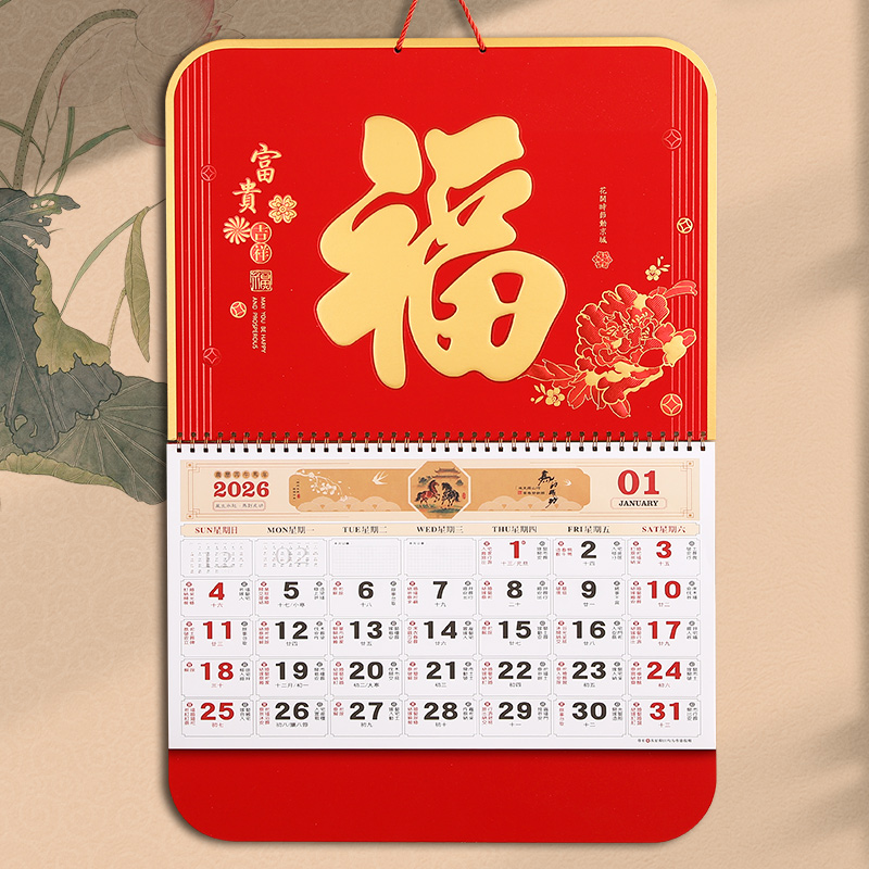 2026马年挂历新款精品加厚福字月历家用挂墙中国传统红色日历国潮创意春节大号高档浮雕日历企业年历定制logo