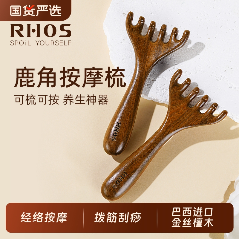 RHOS檀木鹿角头部按摩经络梳子养生头疗五爪头皮拨筋刮痧疏通神器