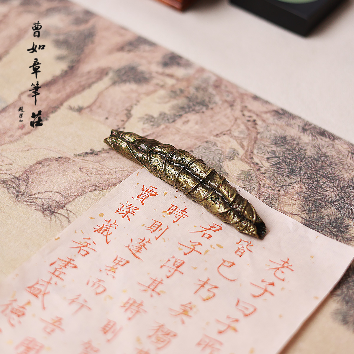 曹如章黄铜荷叶笔搁镇尺桌面摆件文房四宝创意高档精品压纸镇纸