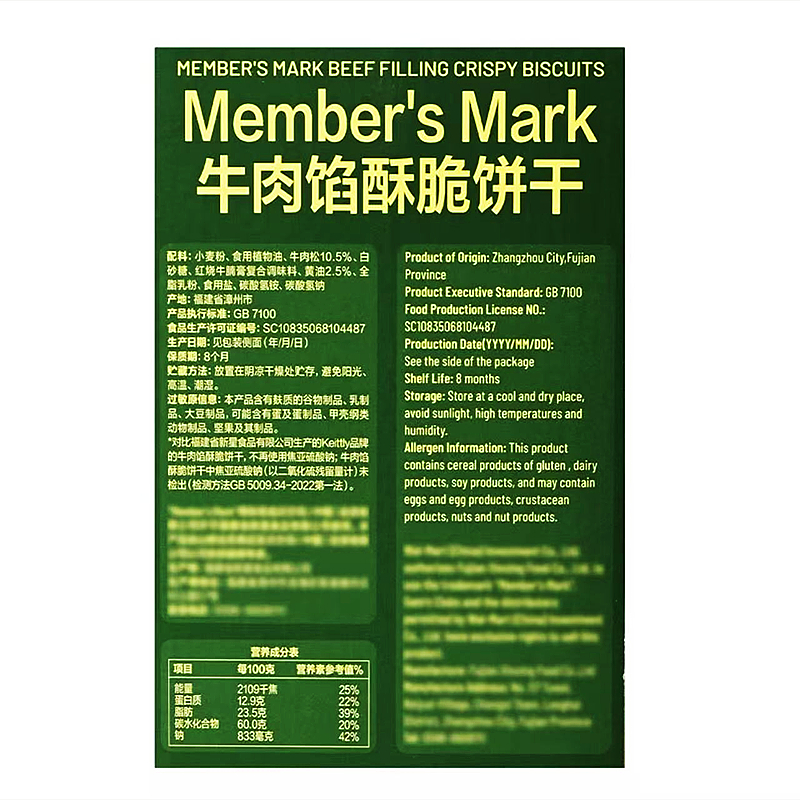 山代购 姆Member’Mark牛肉馅酥脆饼干1kg下午茶零食早餐会员超市