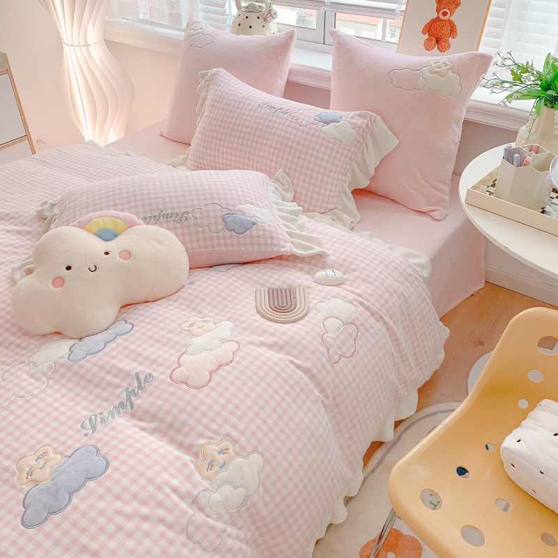可爱风云朵牛奶绒四件套冬季加厚珊瑚绒被套贴布绣小女孩床上用品