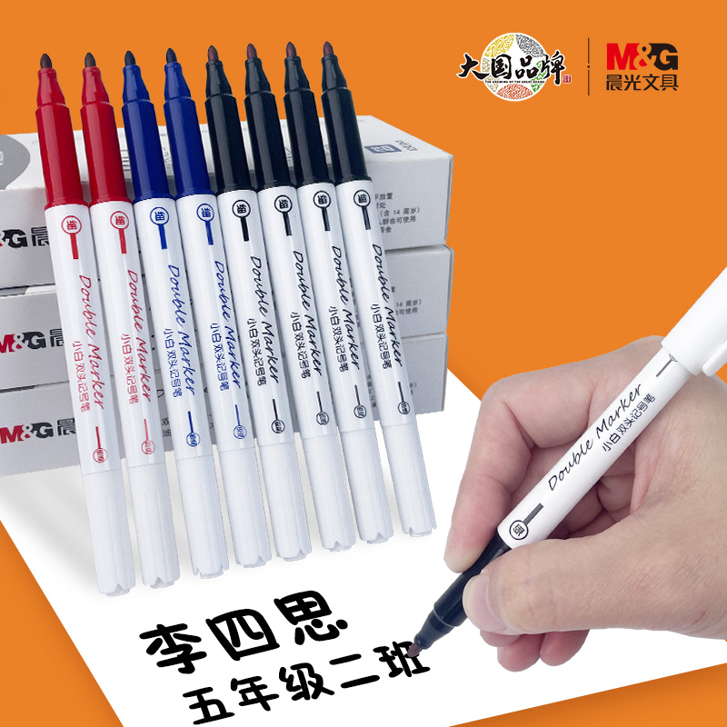 晨光勾线笔记号笔双头油性美术专用小学生黑色红色蓝色两头儿童幼儿园马克笔速干防水防油不掉色工地大头笔