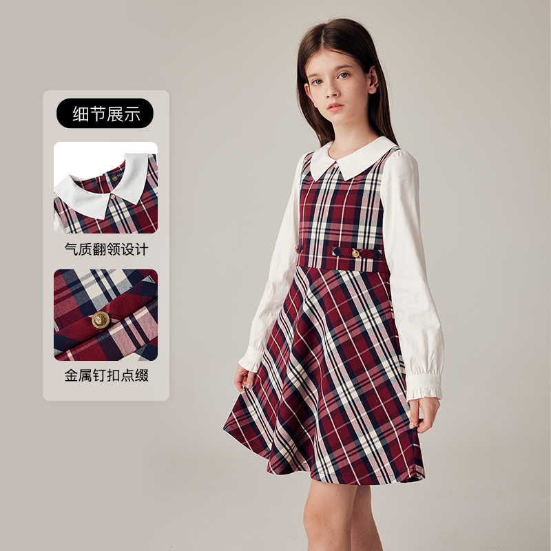 【千金系列】eland kids衣恋女童春秋大童学院风假两件格子连衣裙