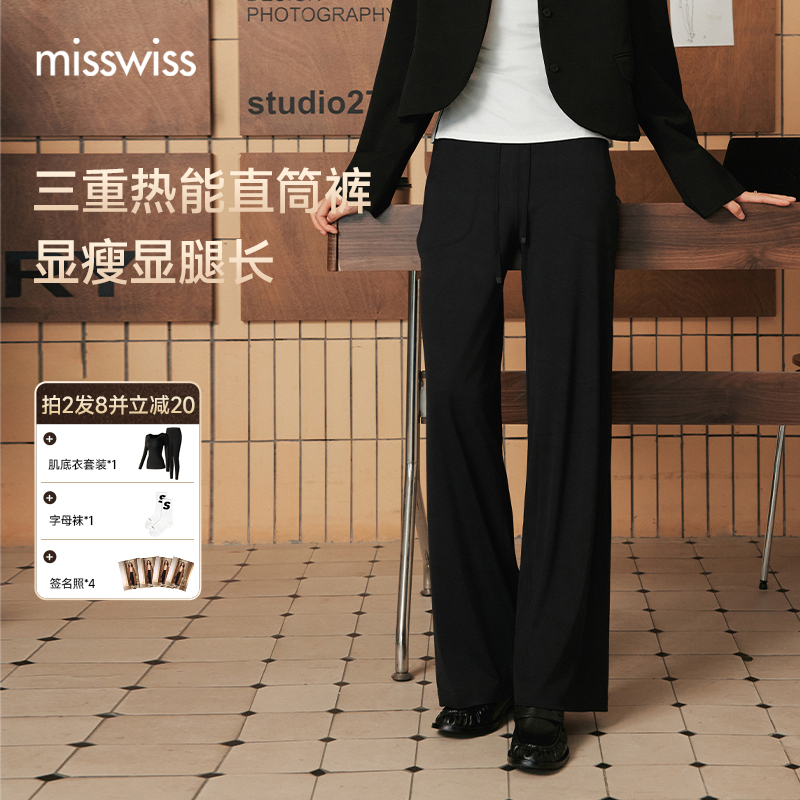 MissWiss收腹直筒裤子女冬季高腰长裤加绒保暖黑色垂感保暖阔腿裤