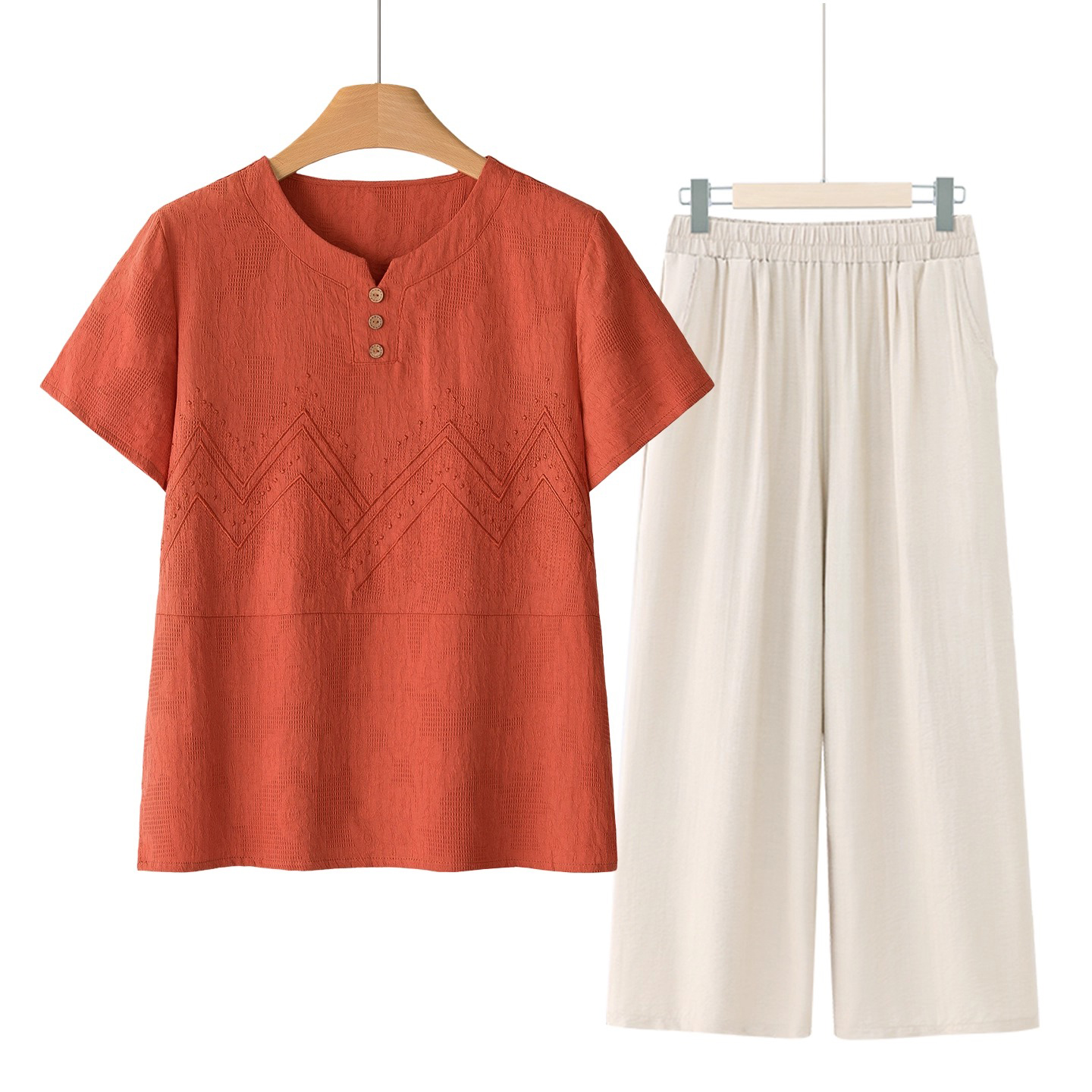 2025新款天丝棉麻套装中老年人新中式两件套妈妈夏装国风短袖T恤