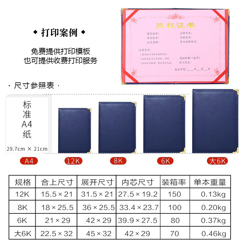 蓝色空白皮革证书定制A4仿皮面荣誉结业证书外壳封皮封面封套定做