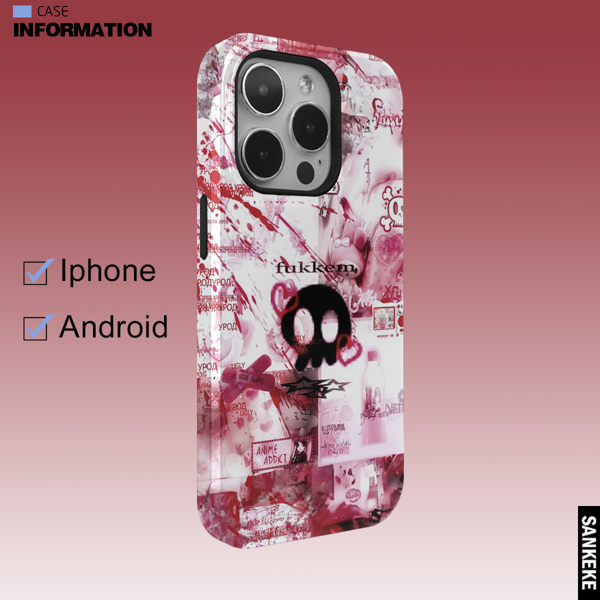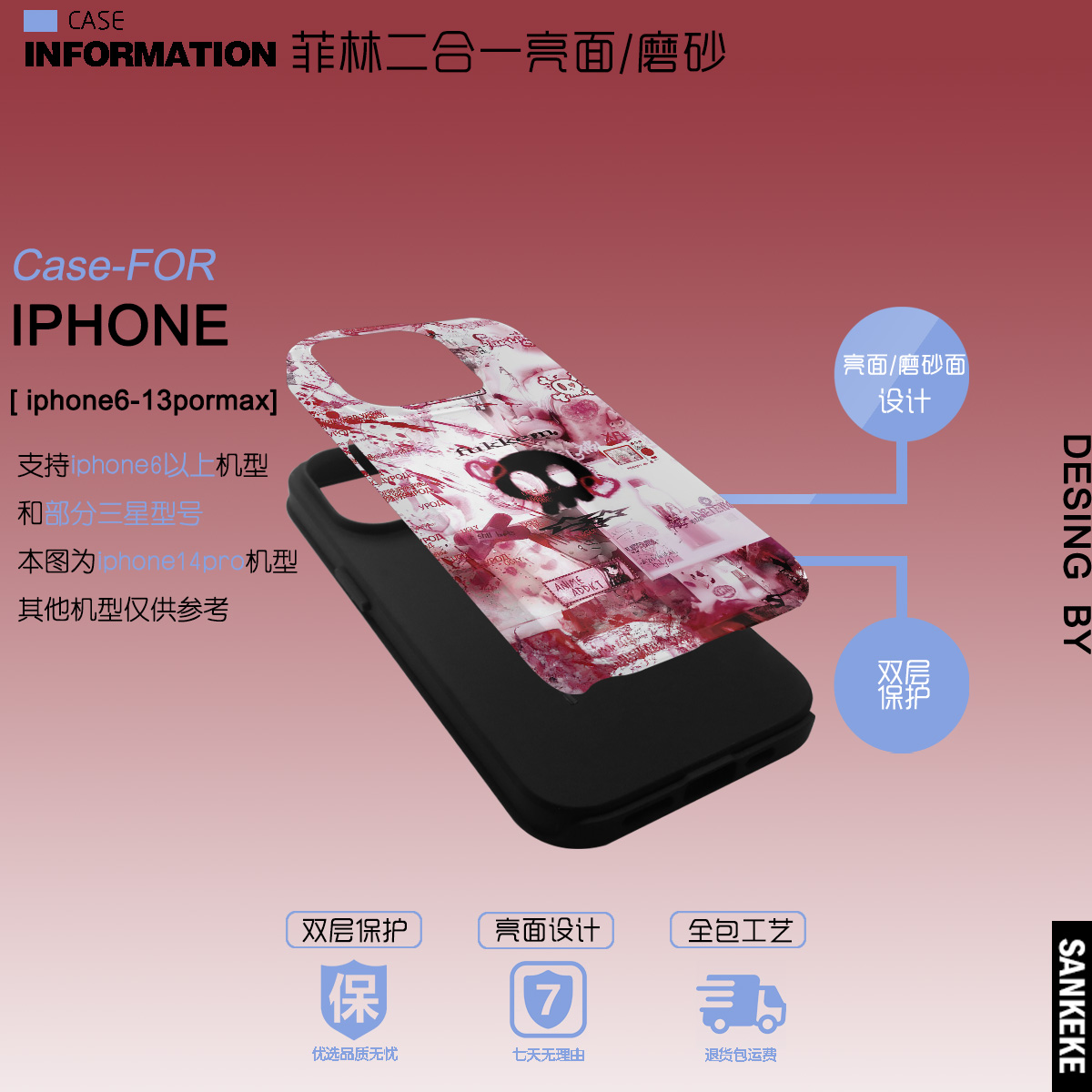 三壳壳原创小众血色可爱小骷髅手机保护壳适用于苹果15promax/14/13/12/11/菲林二合一/IMD亮面精孔防摔保护