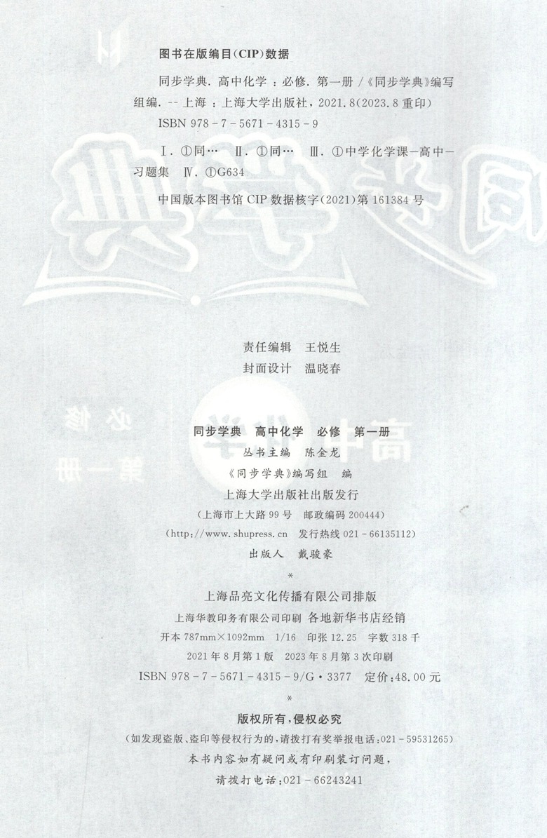 同步学典 高中化学必修1 第一册 第2版 化学 高一年级第一学期/高1年级上 上海大学出版社 上海教辅同步课时单元训练