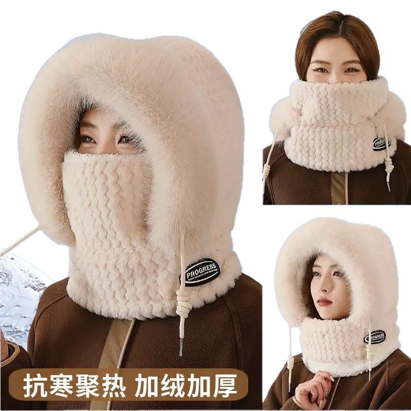 防风帽子女秋冬季骑车保暖护耳套头帽加厚毛绒围脖巾帽口罩一体帽