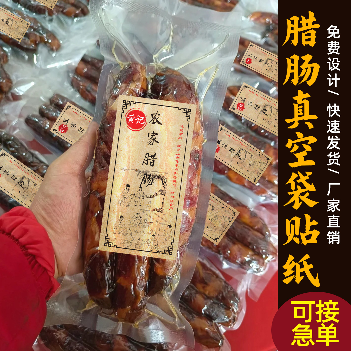 真空袋贴纸定制腊肠腊肉牛肉丸食品包装袋标签logo设计商标定做鸭货鸡爪自粘密封袋土特产礼盒二维码不干胶印