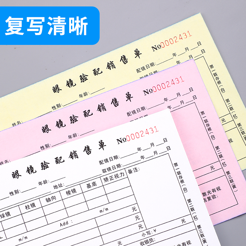 眼镜店验光配镜处方单定做镜片验配收据电脑视光检测服务凭证视力检查表格定配手写开票本视觉检查表小票定做
