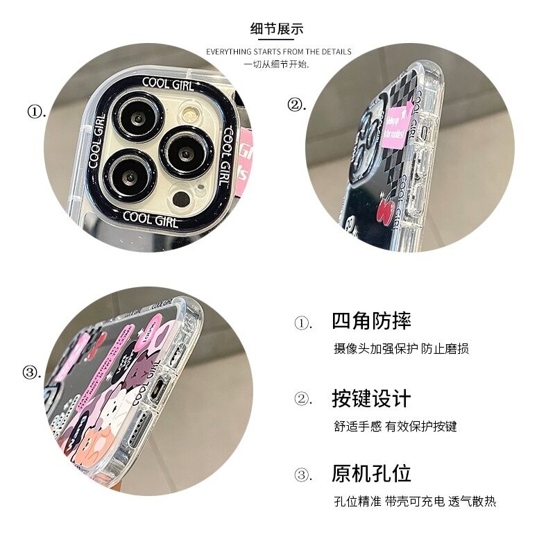 甜妹棋盘格黑粉卡通镜面适用小米15手机壳K80/K70e补妆镜子note14新款K60硅胶13红米K50女12X防摔K40pro+全包