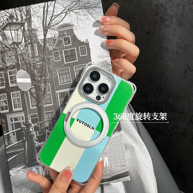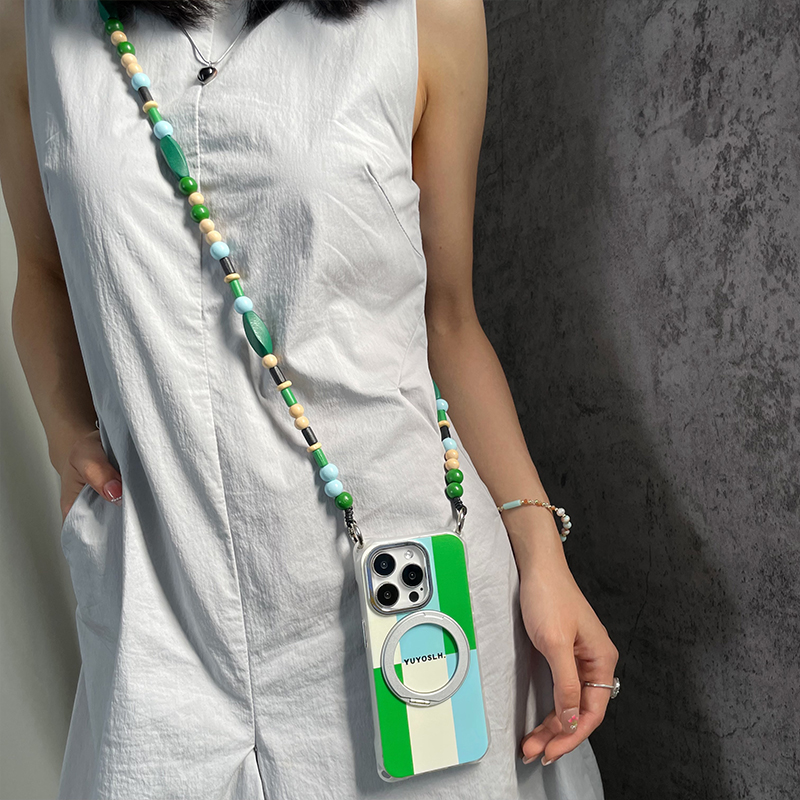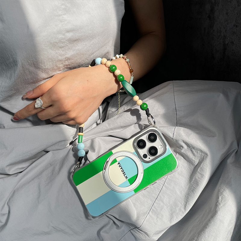 360度旋转支架!蓝绿积木链条棋盘格适用苹果16pro手机壳背带斜跨小米15ultra挂绳mate70pro斜挎可背vivox200