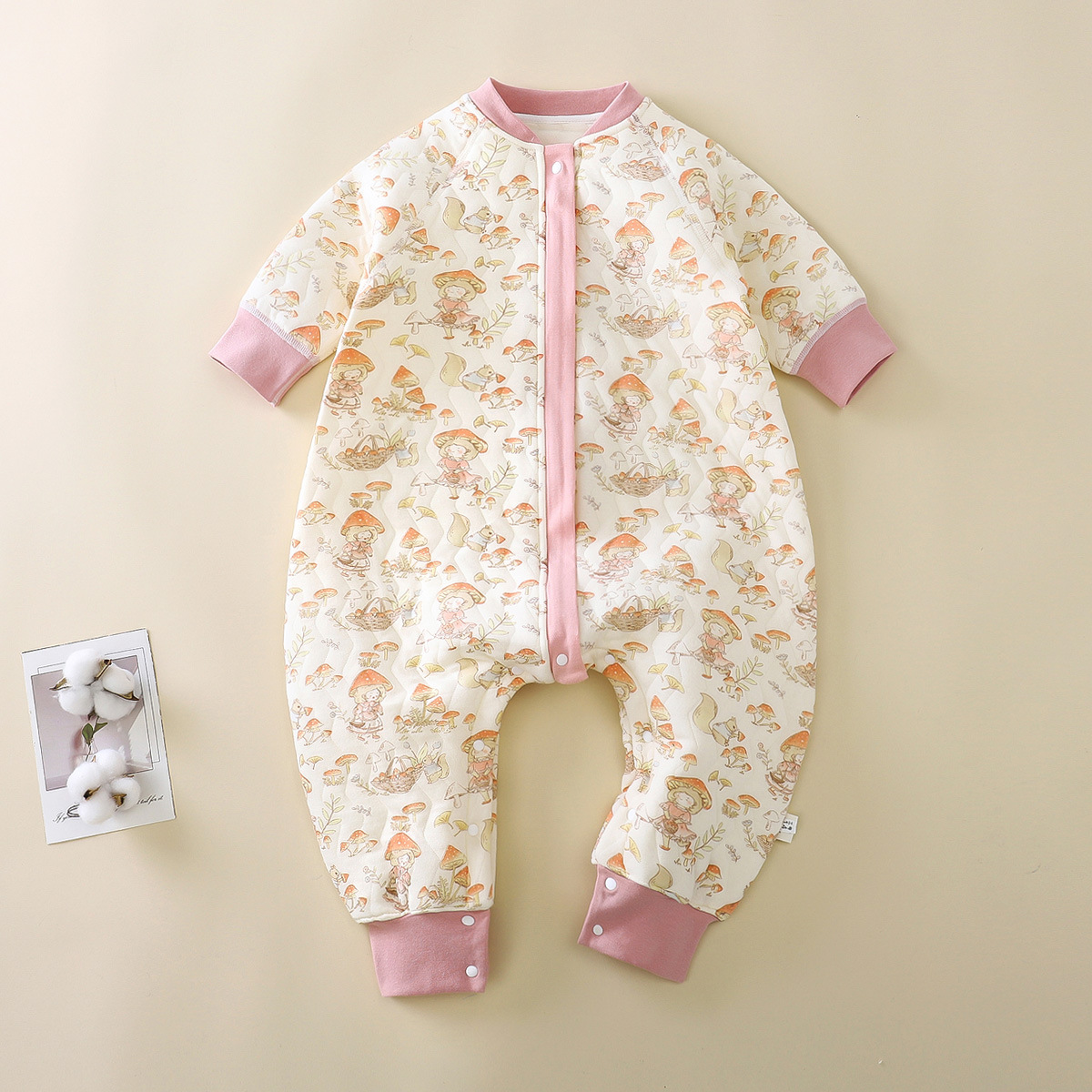 小猪大卫新生儿秋季保暖连体衣男女宝宝卡通印花中开夹棉爬服