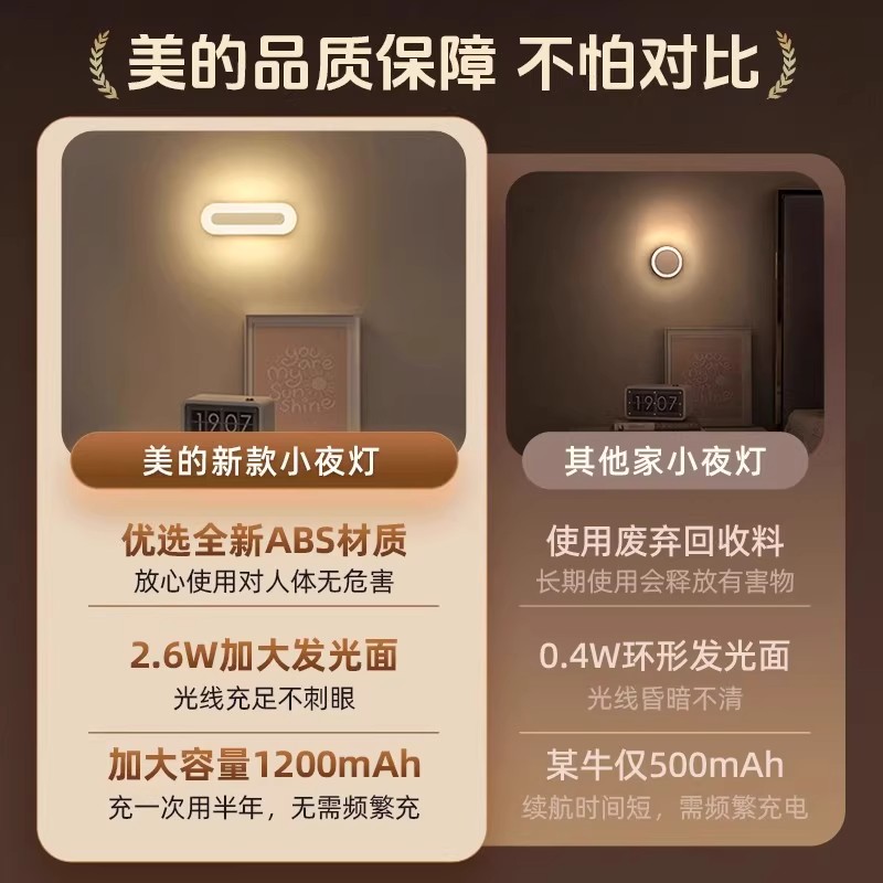 美的人体感应小夜灯智能充电式家用无线过道墙壁起夜楼道感应灯