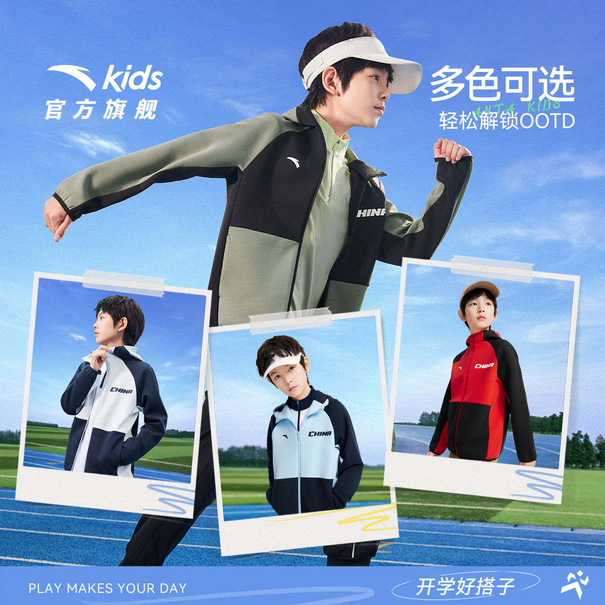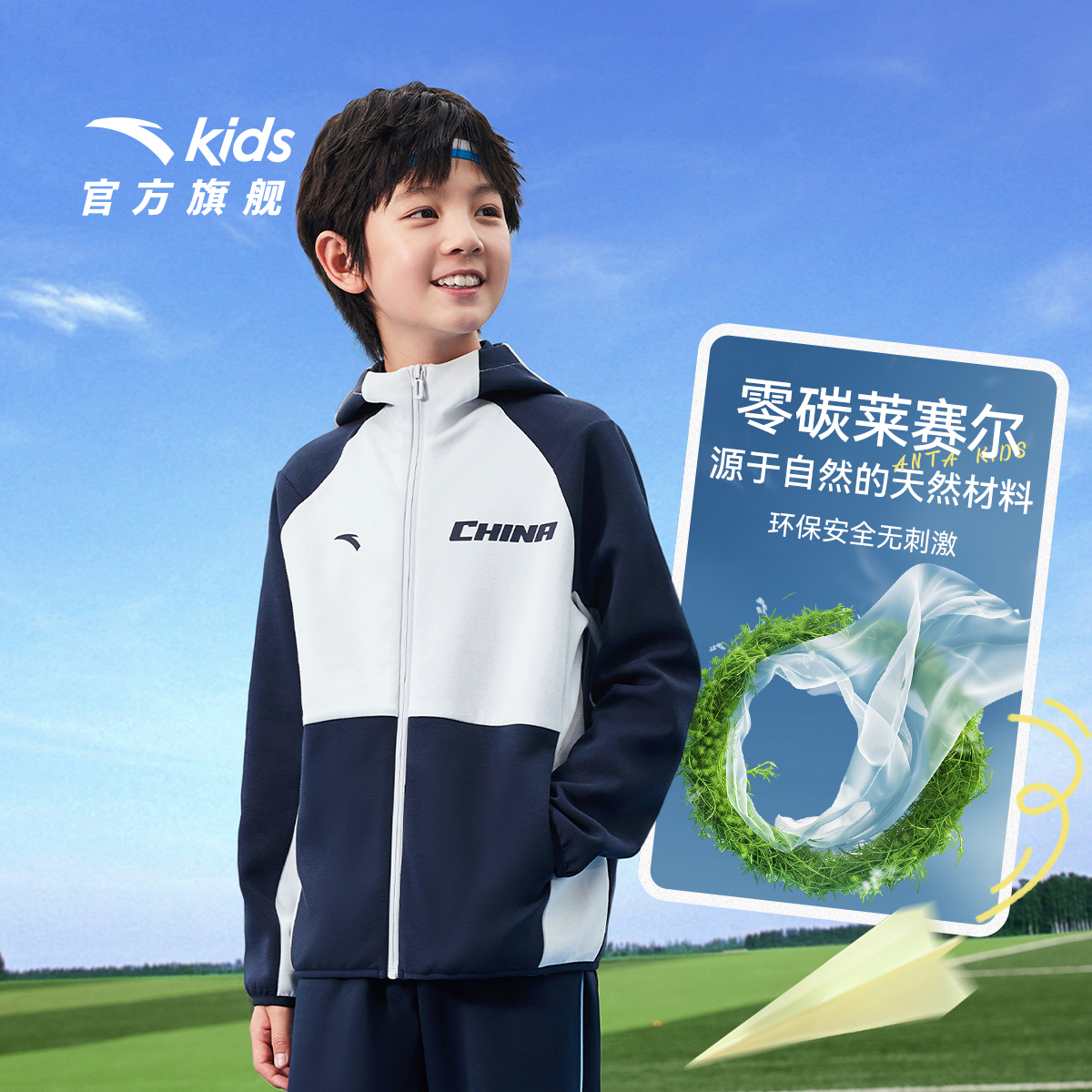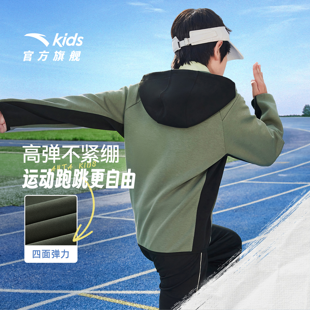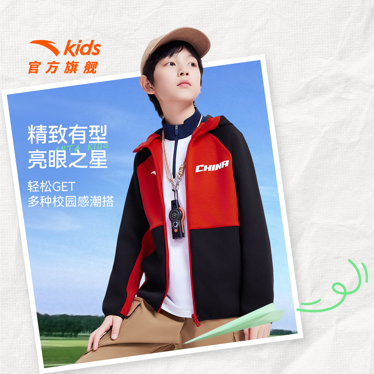 安踏儿童男童针织连帽运动上衣2025秋季新款潮酷撞色学院秋装外套
