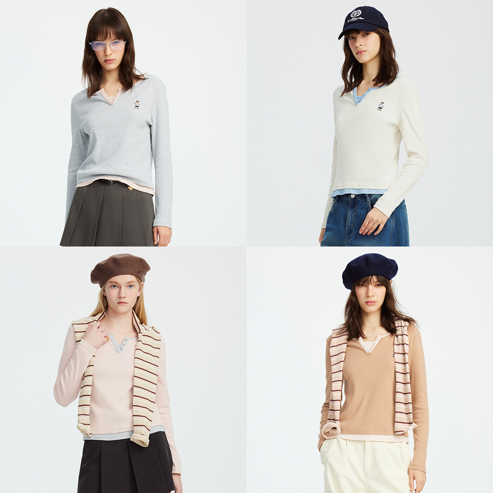 TeenieWeenie小熊女装长袖T恤2025秋季新款假两件拼接亨利领上衣