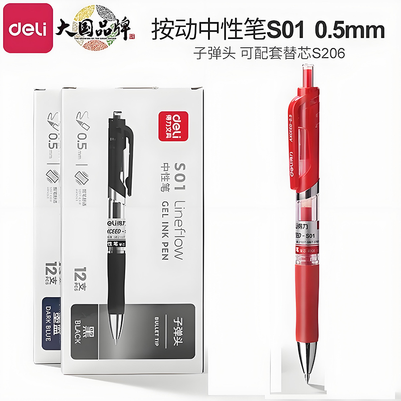 得力 按动中性笔 0.5mm签字笔 黑色弹簧按压型碳素水笔商务考试子弹头配套笔芯 S01办公用品学生文具