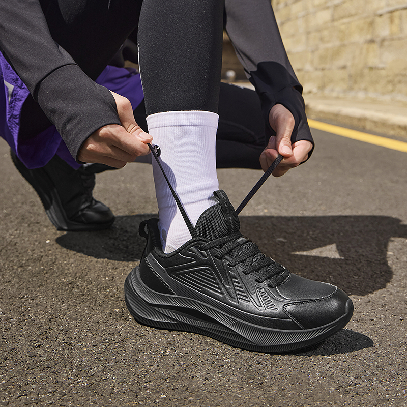 特步跑步鞋男鞋秋季新款黑色运动鞋皮面防泼水爸爸减震网面休闲鞋