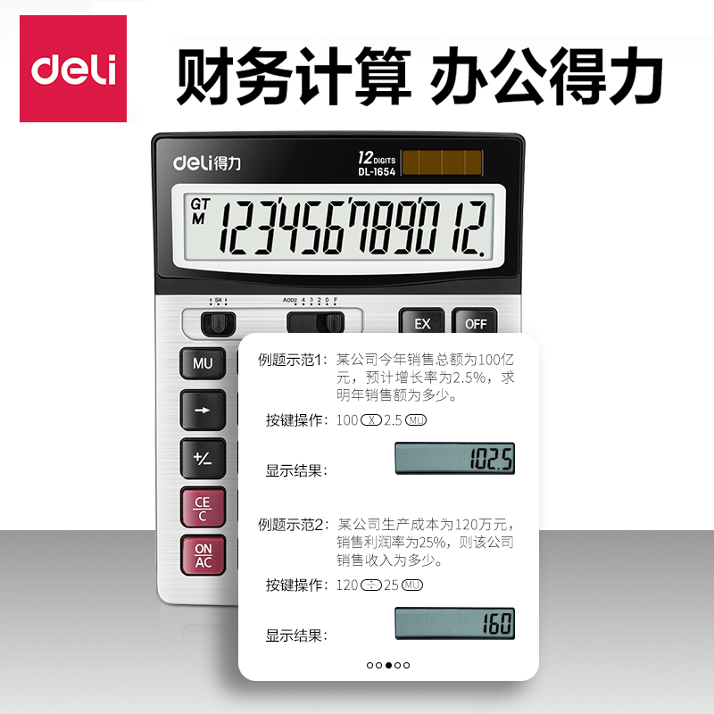 得力财务计算器太阳能双电源四舍五入键大按键会计专用12位计算机