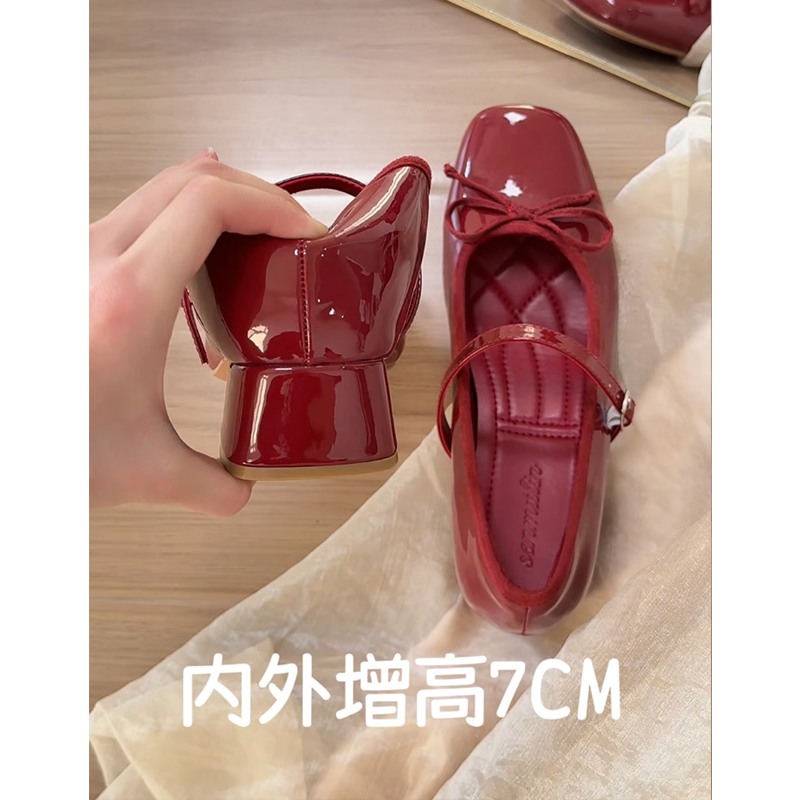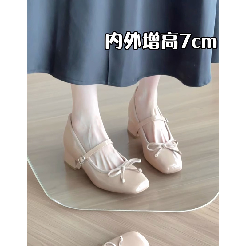 内外增高7cm裸色蝴蝶结芭蕾高跟单鞋女2025新款复古粗跟玛丽珍鞋