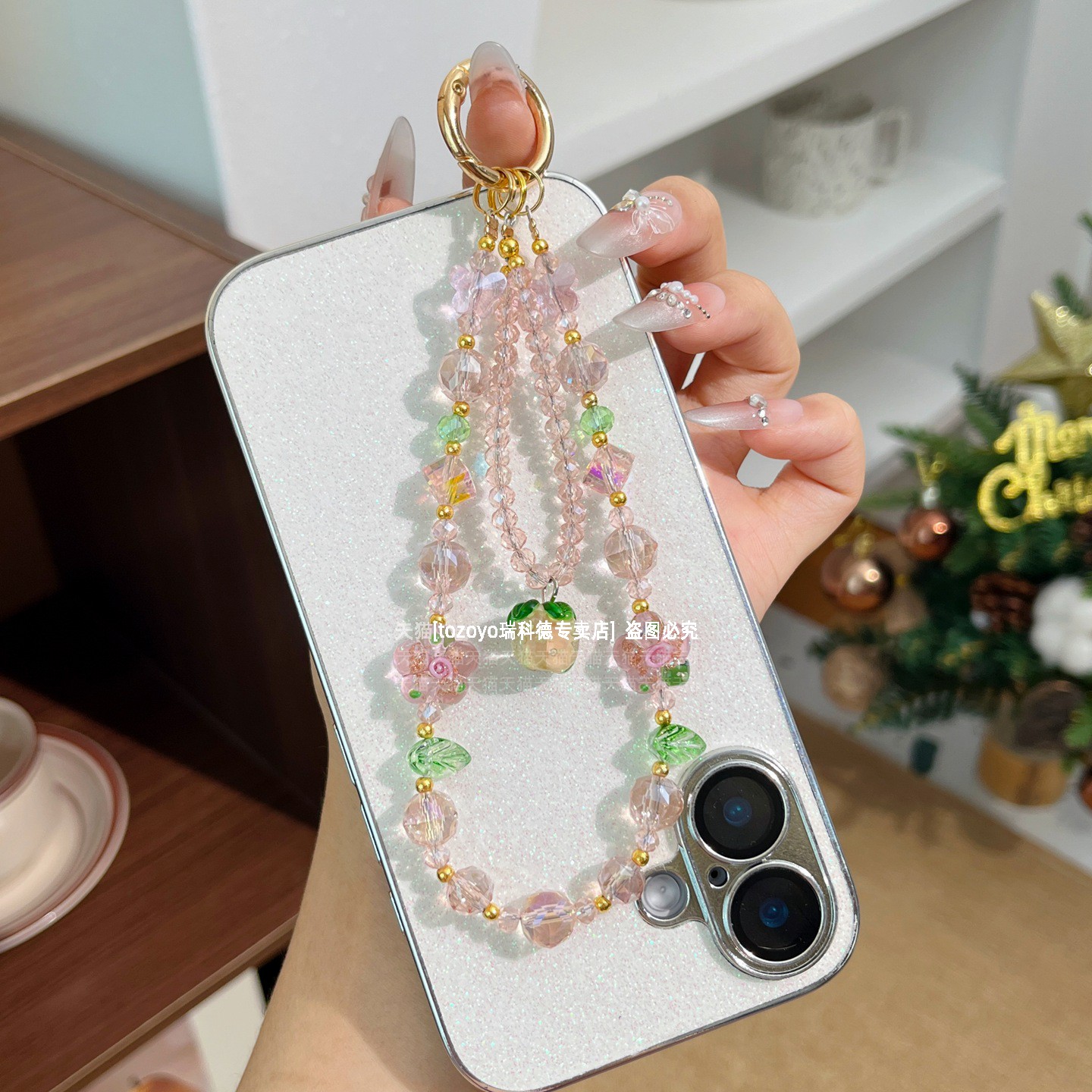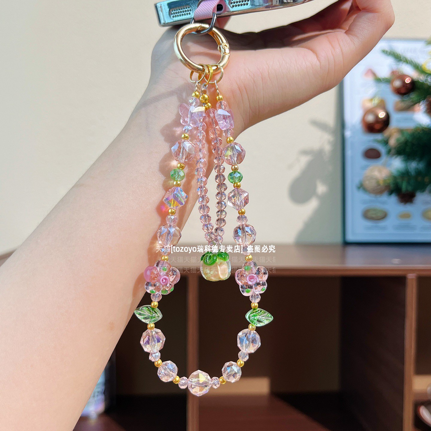桃花粉水晶手机链柿柿如意吊坠手腕挂链精致好看手链女挂饰钥匙扣包包链条防丢挂件高颜值小众串珠腕链垫片壳