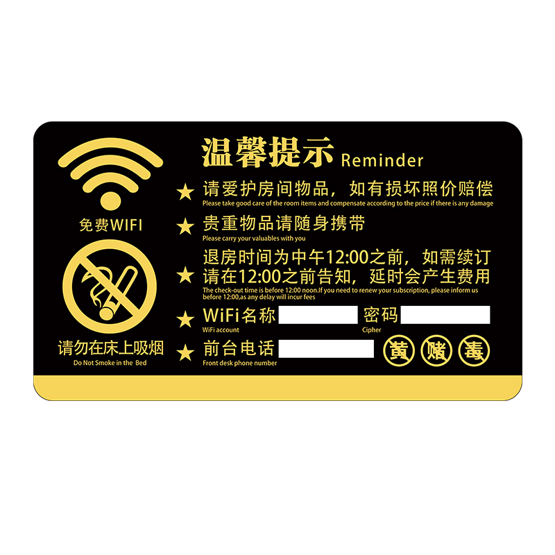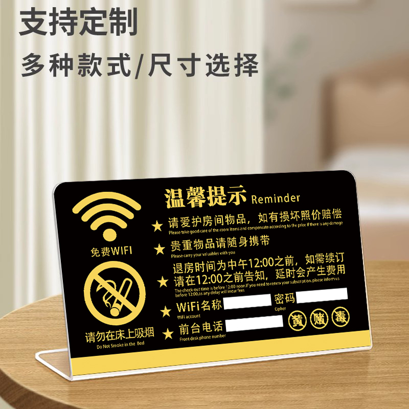 酒店提示牌酒店客房民宿房间温馨提示牌宾馆卧床头用品立式牌WiFi密码请带好您的随身物品提示禁止黄赌毒指示