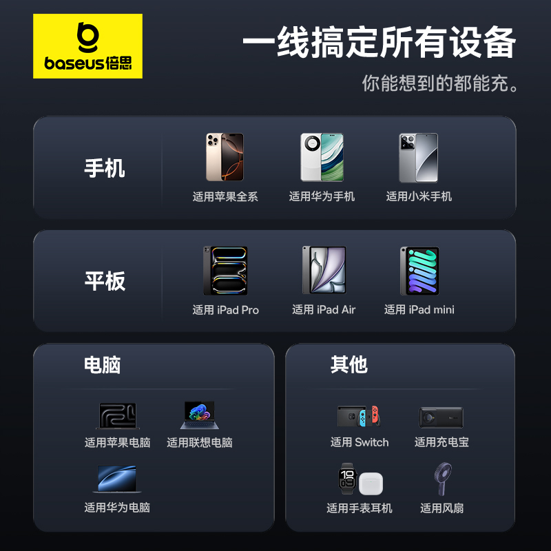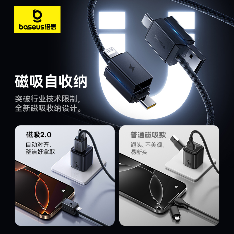 倍思四合一数据线车载充电线三合一快充适用苹果16华为小米iPhone15安卓Typec手机iPad平板14笔记本USB多功能
