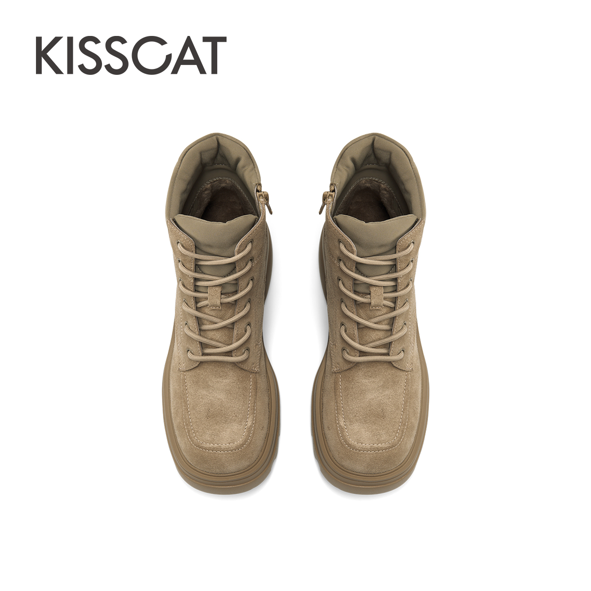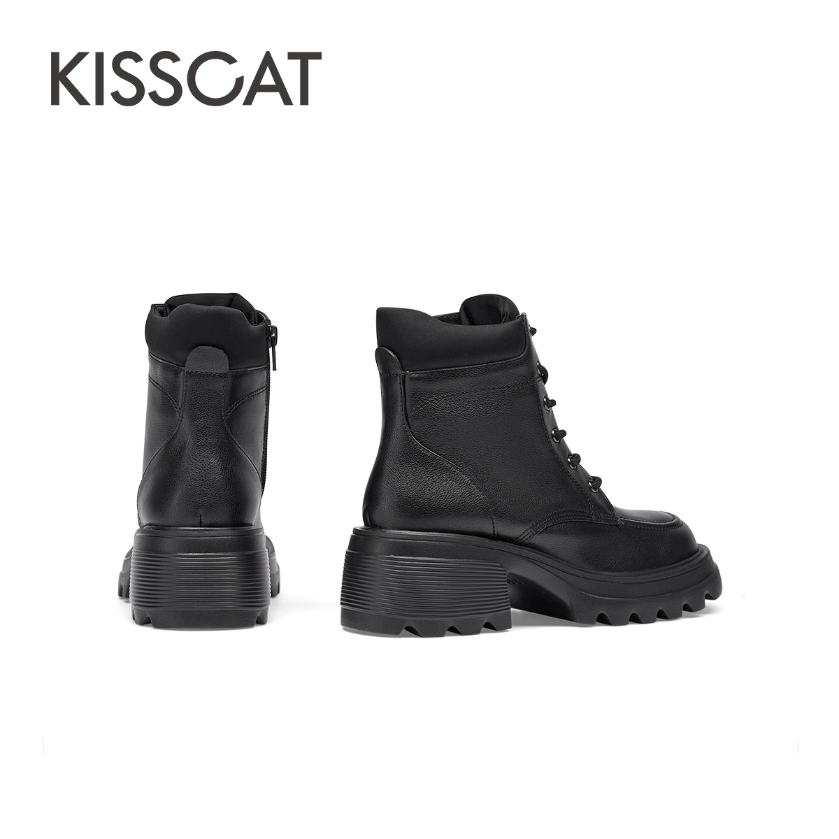 KISSCAT接吻猫新款真皮短靴系带大黄靴增高厚底马丁靴女英伦风