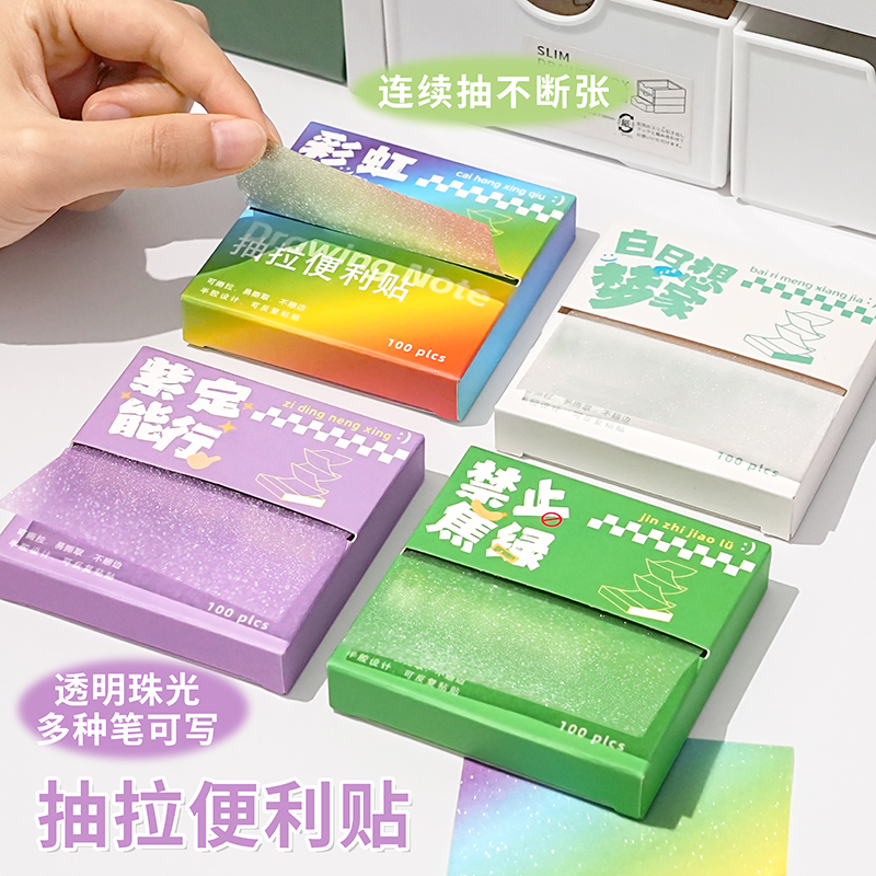 可抽拉便利贴彩色渐变珠光高颜值透明便签纸可粘贴标签贴纸强粘性速记事贴小学生初中生专用错题改正贴备忘录