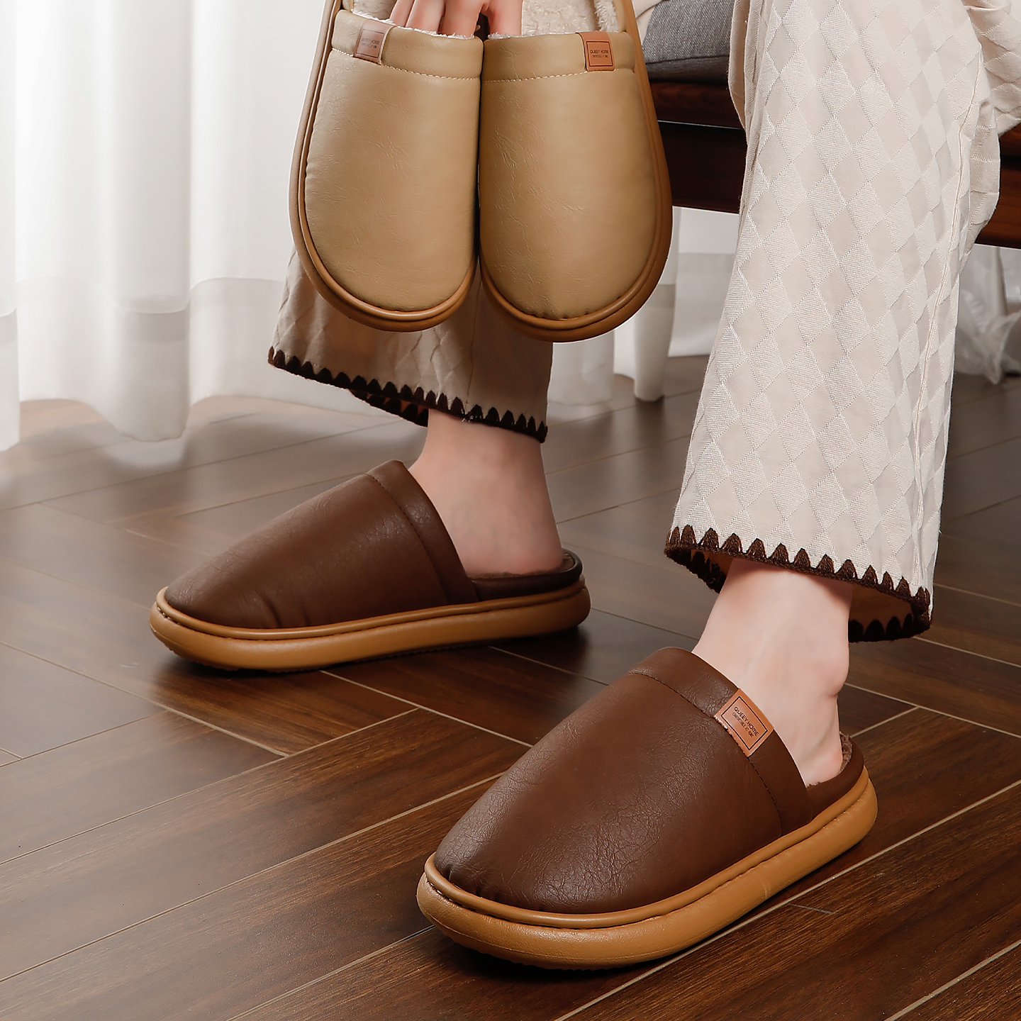 防水棉拖鞋男女冬季室内加绒保暖家居家防滑防臭抑菌PU皮拖秋冬天