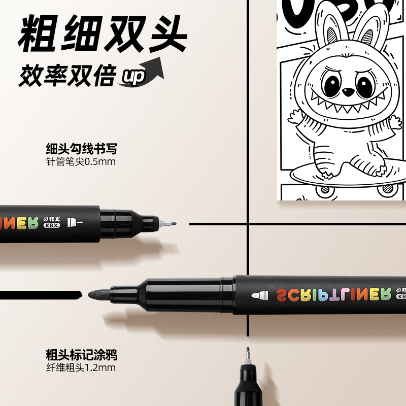 儿童美术勾线笔小双头一年级幼儿园美术专用卡皮巴拉黑色不透色描边勾边笔极细线描笔小学生签名笔油性记号笔