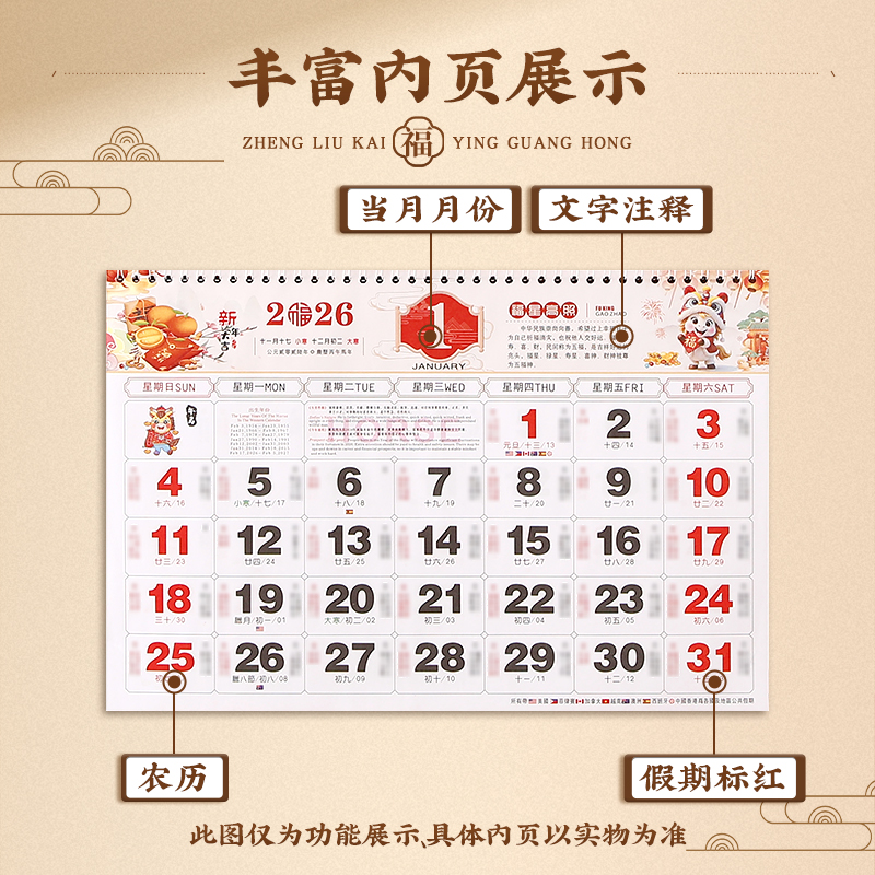 2026年高端挂历正六开荧光红福牌家用挂墙马年正版一月一张中国风福字创意大号加厚月历企业印刷广告定制logo