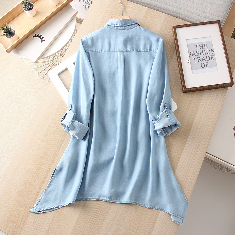 莱赛尔春夏柔软透气薄款天丝牛仔衬衫外套女装不规则下摆长袖衬衣
