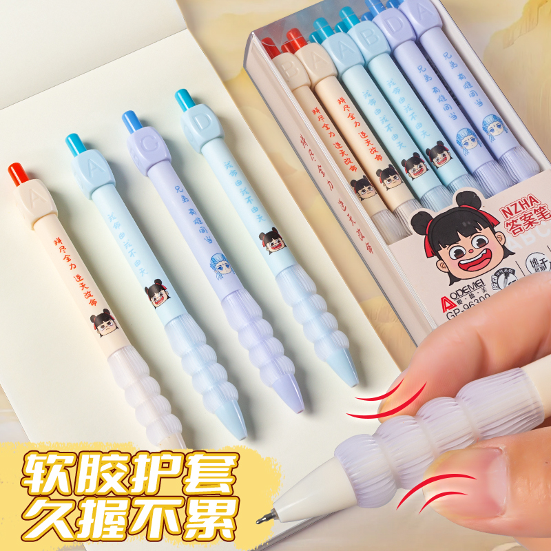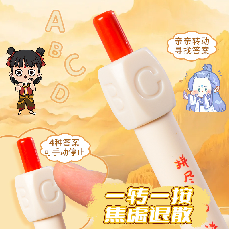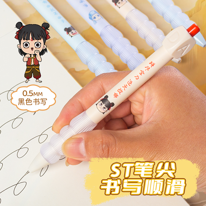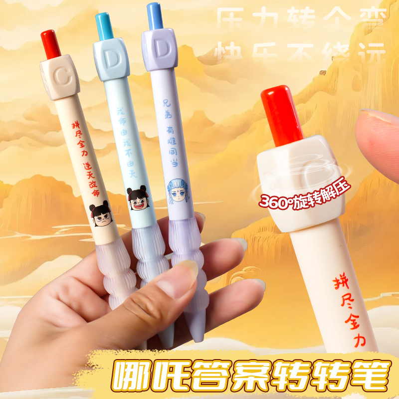 哪吒转转笔趣味答案之笔高颜值解压卡通按动中性笔软握胶儿童减压学生专用顺滑刷题中性笔黑色ST头刷题笔文具