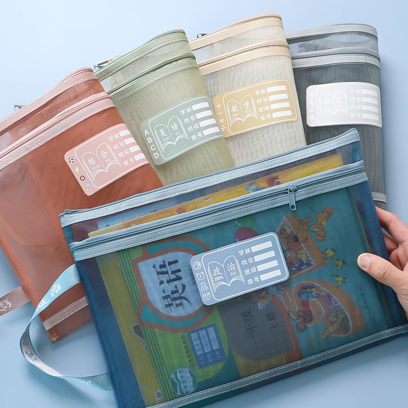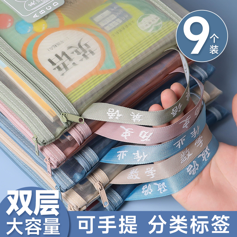 学科科目分类文件袋拉链式双层大容量小学生用资料书本课本分科书袋试卷收纳袋学生装卷子作业袋子A4透明网纱